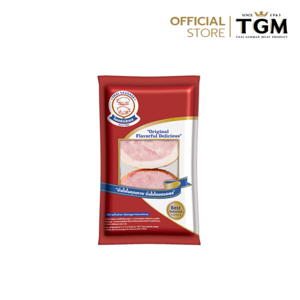 ผลิตจากเนื้อหมูส่วนสะโพกตัดแต่ง ลดขนาด นวดคลุกเคล้าเครื่องเทศจากประเทศเยอรมันนี ขนาด 3.5 x 3.5 นิ้ว แผ่นขนาดเล็ก เนื้อผลิตภัณฑ์มีสีชมพู่อ่อน หมอกลิ่นเครื่องเทศ รสชาติกลมกล่อม